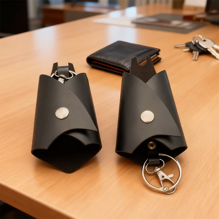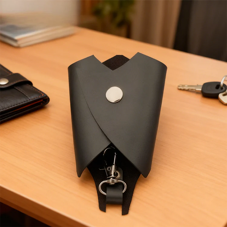 Tillverkad av lÀder och mocka med sömmar, har den en sÀker ficka med dragkedja för mynt, nycklar eller smÄ nödvÀndigheter. MetallklÀmman gör det enkelt att fÀsta den pÄ vÀskor, bÀlten eller ryggsÀckar. HÄllbar, stilren och full av personlighet.