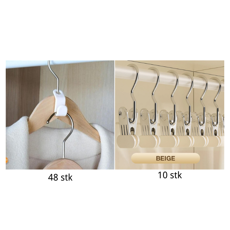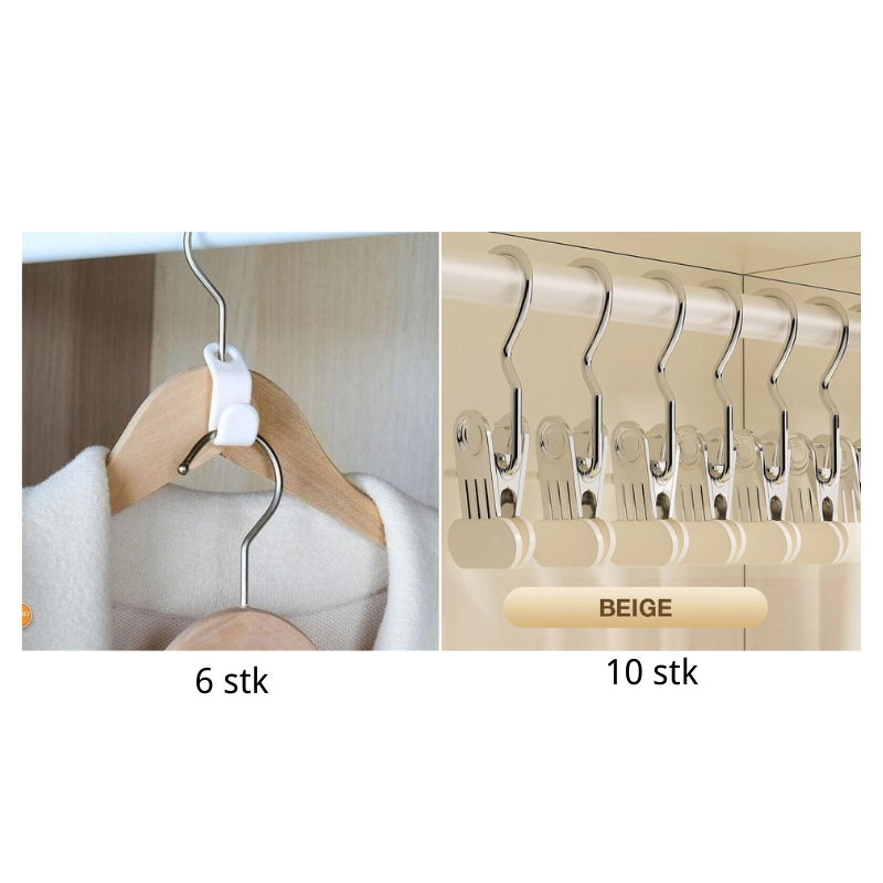 Med denna hängare krok set kan du hänga byxor, blusar, skjortor och kjolar tillsammans på en "hängare kedja", spara mycket garderobsutrymme. Samtidigt kan den användas för att hänga små tillbehör som väskor, bälten, halsband etc.