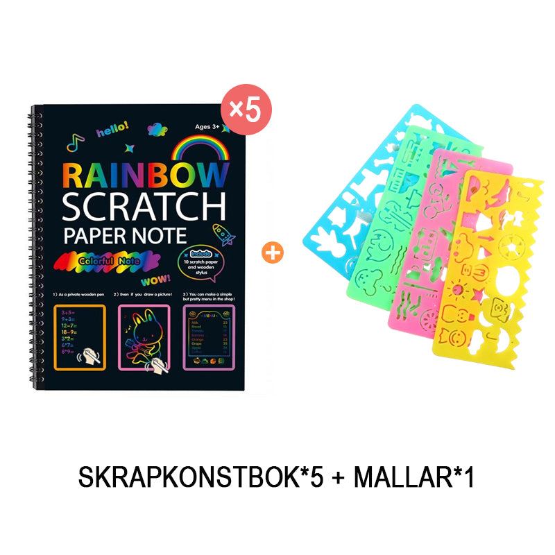 Lätt att använda: Ingen målning behövs – skrapa bara ytan på det svarta skrappappret med träpennan för att avslöja de fantastiska färgglada mönstren under. Barn kan använda den för att rita klotter och skapa häftiga illustrationer och designer. Skrapkonstpappret hjälper till att utveckla barns visuella färdigheter och kreativitet. Det är ett roligt sätt att uppmuntra barn att skriva roliga meddelanden och rita bilder till varandra, samt till vänner och familj.