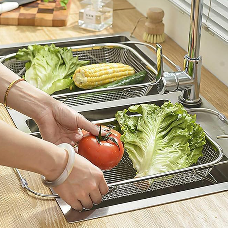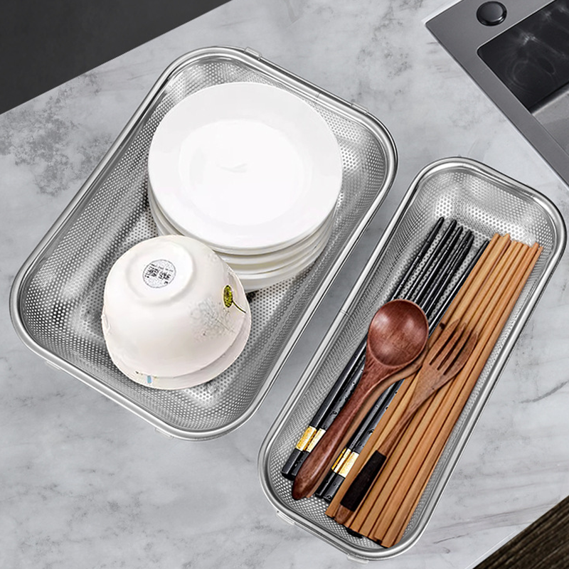MULTIFUNKTIONELL TÖMNING OCH FÖRVARING : Fint perforerat nät möjliggör snabb vattendränering samtidigt som det säkert förvarar små föremål som ätpinnar, bestick eller ömtåliga produkter. Fungerar även som förvaringsbricka för frukt, grönsaker eller tallrikar, vilket möjliggör mångsidig användning utöver grundläggande tömningsuppgifter.